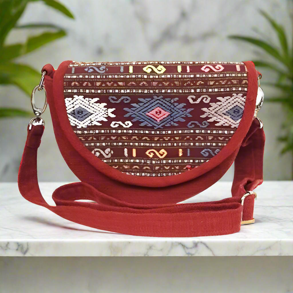 The intricate design on the flap closure adds a touch of traditional elegance, while the maroon strap and metal rings ensure durability and style. The adjustable strap allows for versatile wear, making it perfect for both everyday use and special occasions.