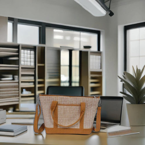 Elevate your everyday style with this chic and versatile tote bag, handmade in Laos from 100% cotton. Crafted with a beige and brown color scheme, this bag features a sophisticated grid pattern on the main body, complemented by solid brown accents on the handles, base, and trim.