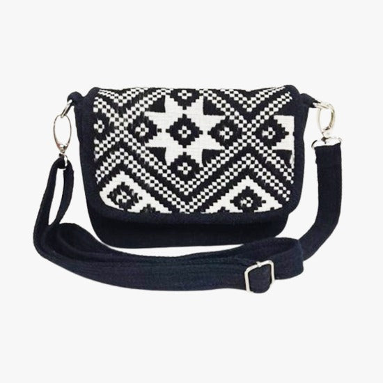 Elevate your accessory game with this handwoven shoulder bag, crafted from 100% cotton in Laos. Featuring a striking black and white geometric pattern on the flap, this bag is a blend of traditional craftsmanship and modern style. The intricate diamond and triangular shapes create a bold design that stands out.