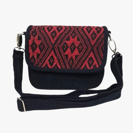 Make a statement with this handwoven shoulder bag, crafted from 100% cotton in Laos. The bag features an eye-catching geometric pattern in red and black on the flap, creating a striking contrast with the solid black body of the bag.