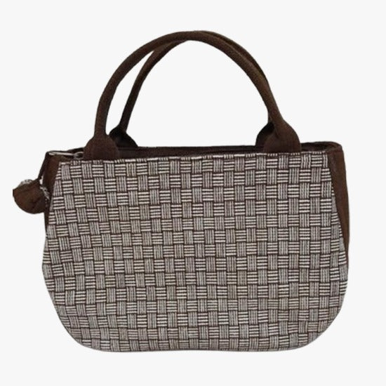 Discover the charm of this handcrafted brown and white checkered tote bag, made from 100% cotton in Laos. This beautiful bag features a timeless checkered pattern, complemented by sturdy brown handles and a woven design that showcases meticulous craftsmanship.